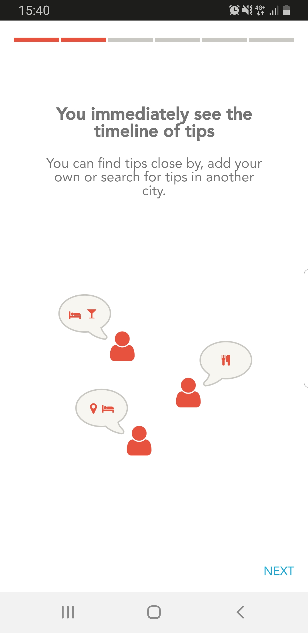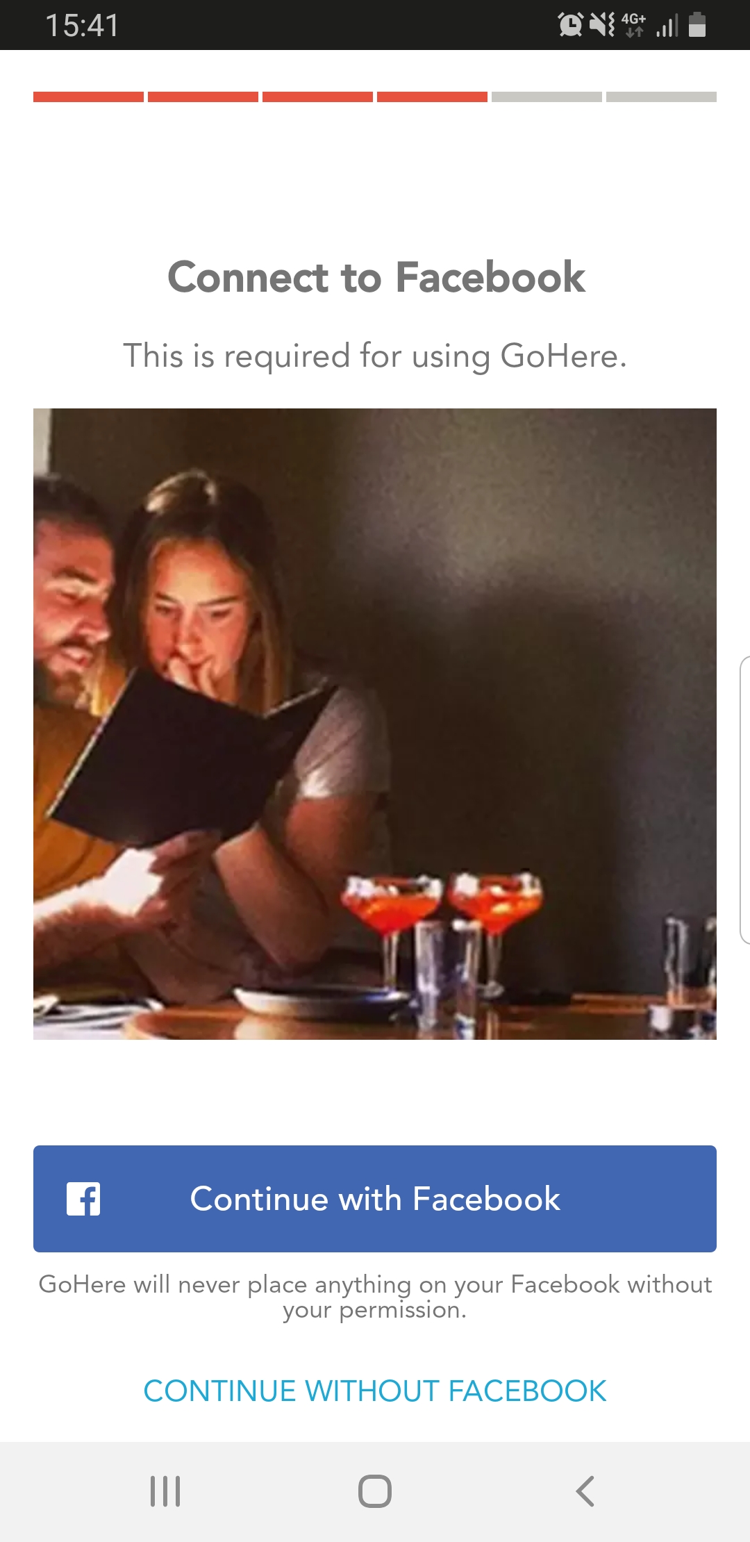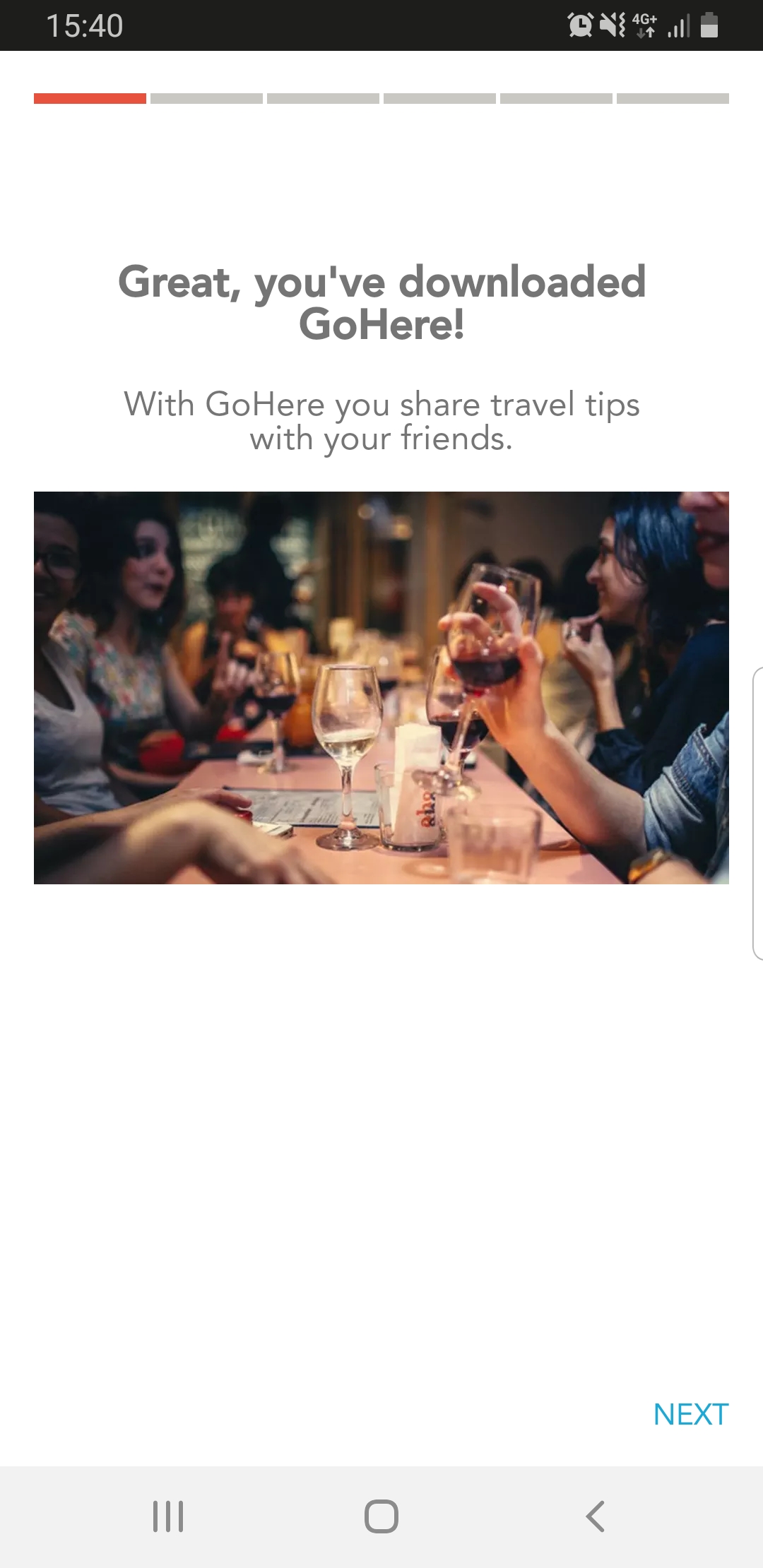 Op dit moment is de onboarding van de GoHere app opgebouwd in 6 schermen. De eerste stap in de onderzoekscyclus zal gericht zijn op de deze onboarding te analyseren en na te gaan waar gebruikers op het moment problemen ervaren.