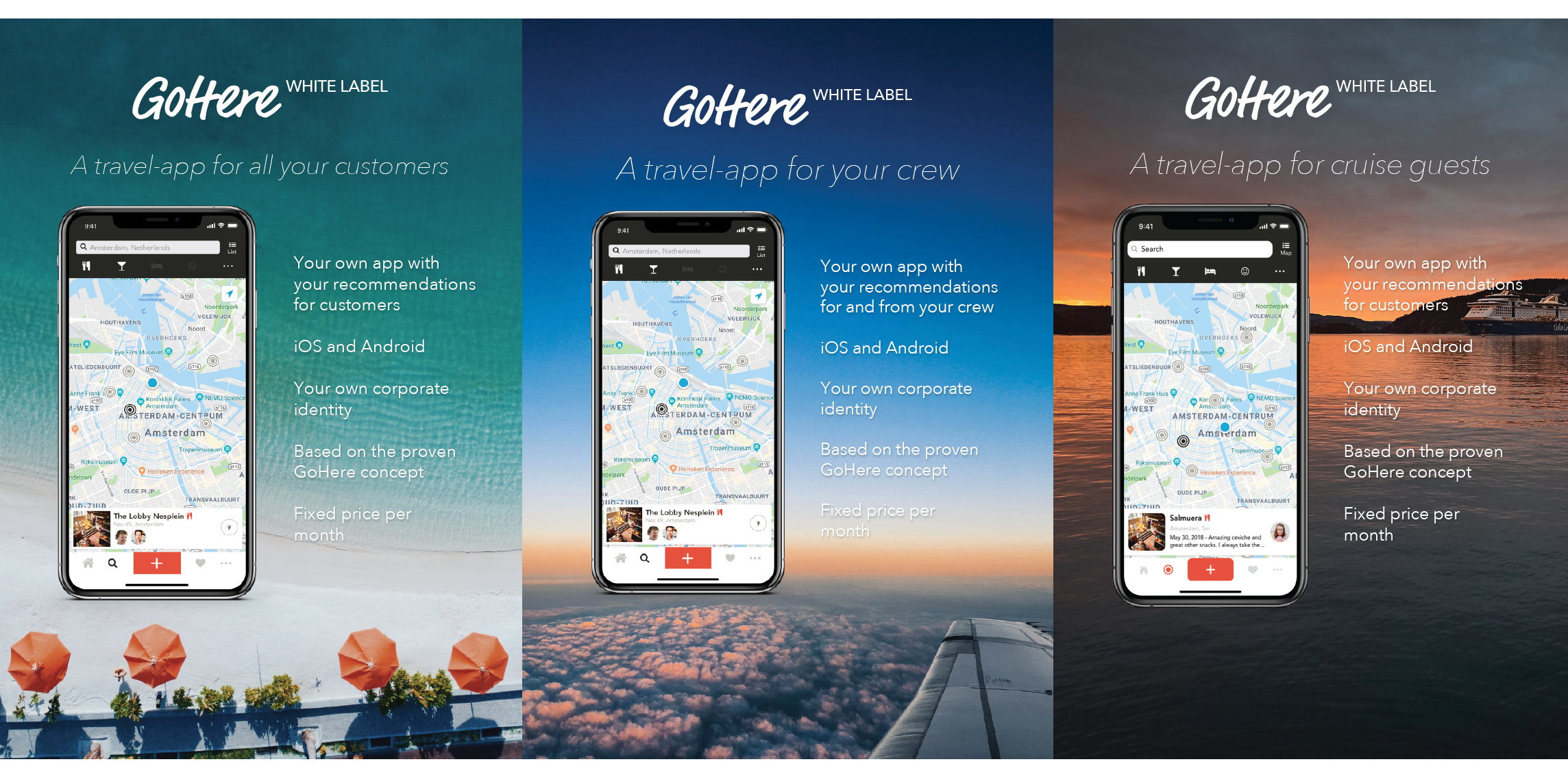 De website is gemaakt in een aantal varianten waarbij deze ieder een eigen doel hebben. De eerste versie is een landing page voor GoHere zelf in het Engels en in het Nederlands. De volgende landing page is een algehele white label landing page voor bedrijven die een eigen app willen lanceren in het GoHere framework. Ook zijn er nog 2 pagina’s gemaakt voor specifieke doelgroepen zoals een pagina voor vliegmaatschappijen en een pagina voor cruisemaatschappijen.