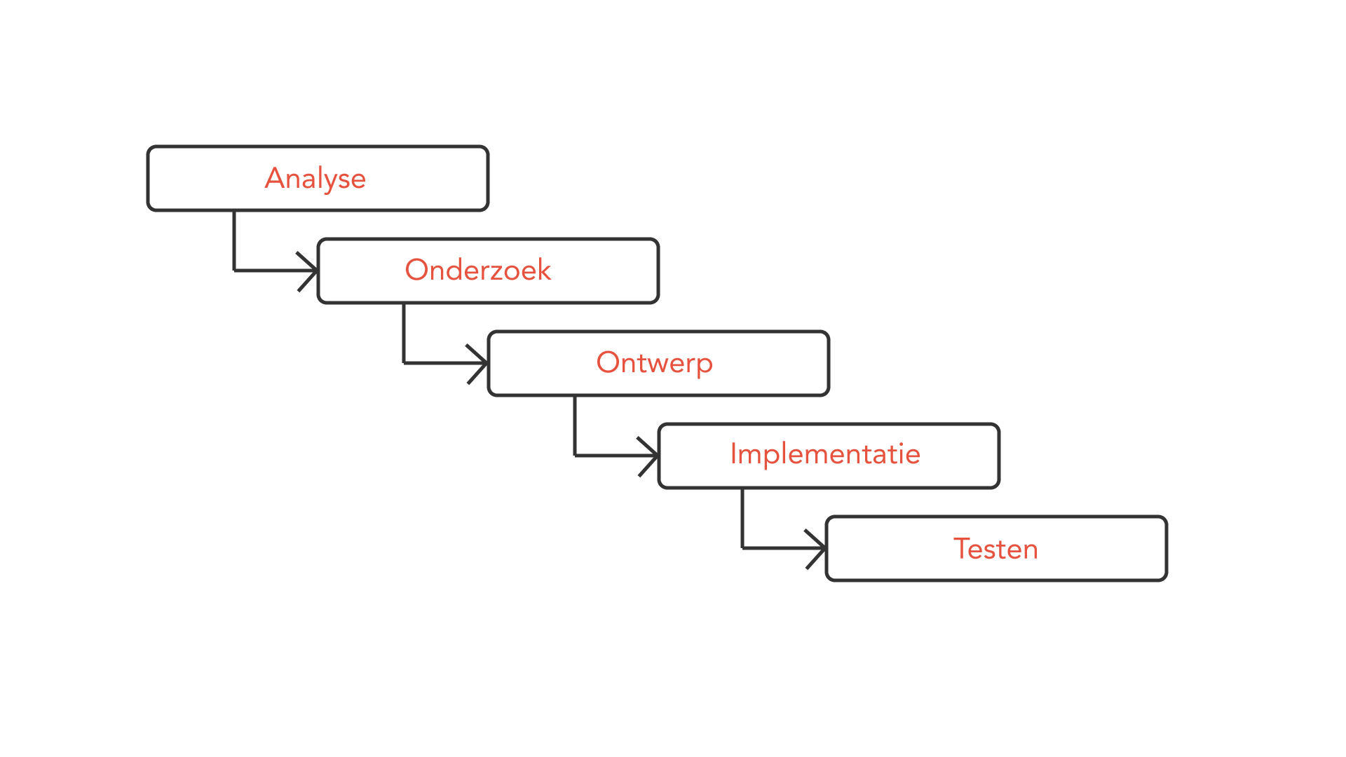 De eerste gedachten was om te werken in korte sprints van een week. Echter bleek als snel dit niet haalbaar was voor dit project. Vaak liepen sprints uit waardoor uiteindelijk is gekozen voor de waterval methode. Dit gaf meer vrijheid in hoe lang bepaalde fases duurde in het proces. Hieronder de watervalmethode waar mee gewerkt is.